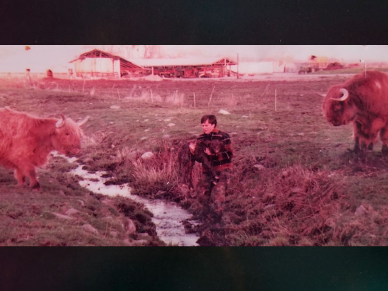 Brook, a Scottish Highland was born in 1991 – Farmland’s firstborn endangered farm animal. She got her name because when she was born, she rolled down an embankment into a brook. Photos: Larry carried the baby safely back to Mom while Dad looked on. Later: A mother and child pet baby Brook (AKA Moo Moo.)