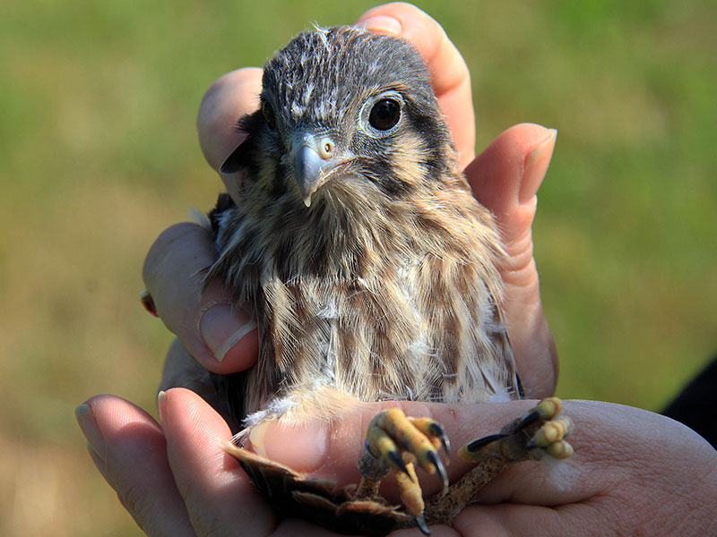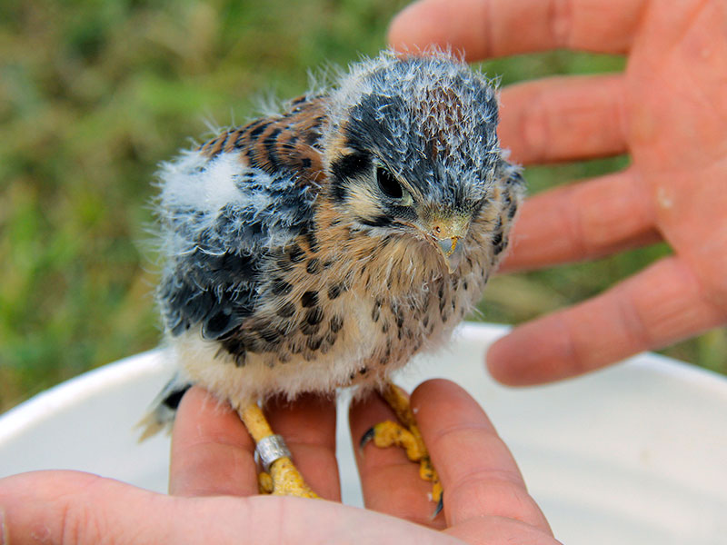 To help repopulate the species, Davis Farmland has teamed up with the MA Division of Fisheries & Wildlife and set up multiple Kestrel nesting boxes. Our farm is one of the best locations for Kestrel nesting because we have hundreds of acres of undeveloped forestry and wildlife, perfect for kestrels to build their habitats. We have already hatched and banded over 20 of these tiny, beautiful falcons. One of the boxes can actually be viewed right from the parking lot of Davis Mega Maze.